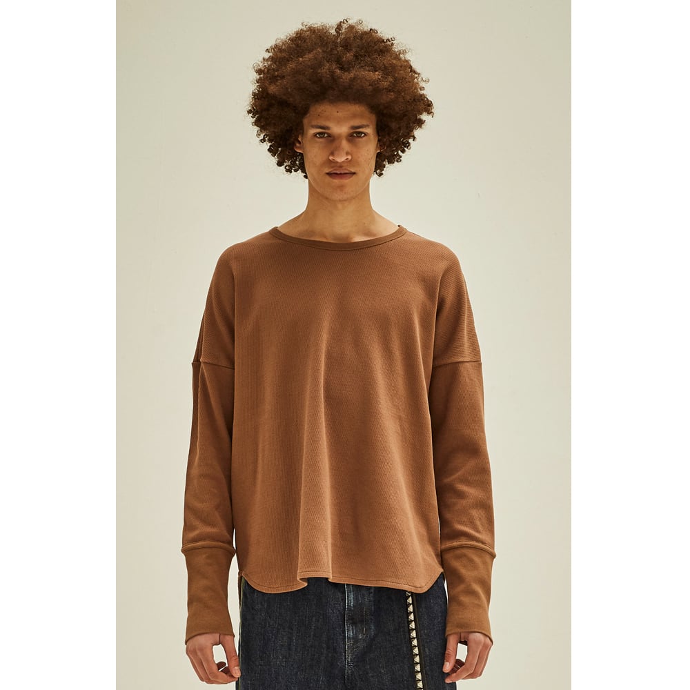 本来はタイトなシルエットでインナーに使用されることの多いワッフル素材をあえてルーズなシルエット感のアイテムに使用しています。