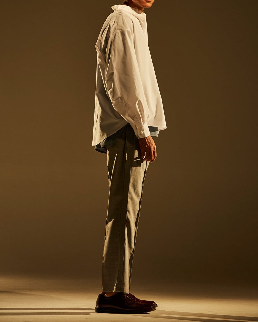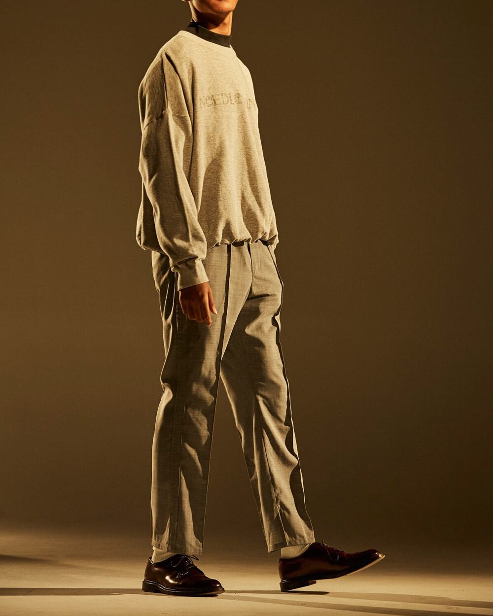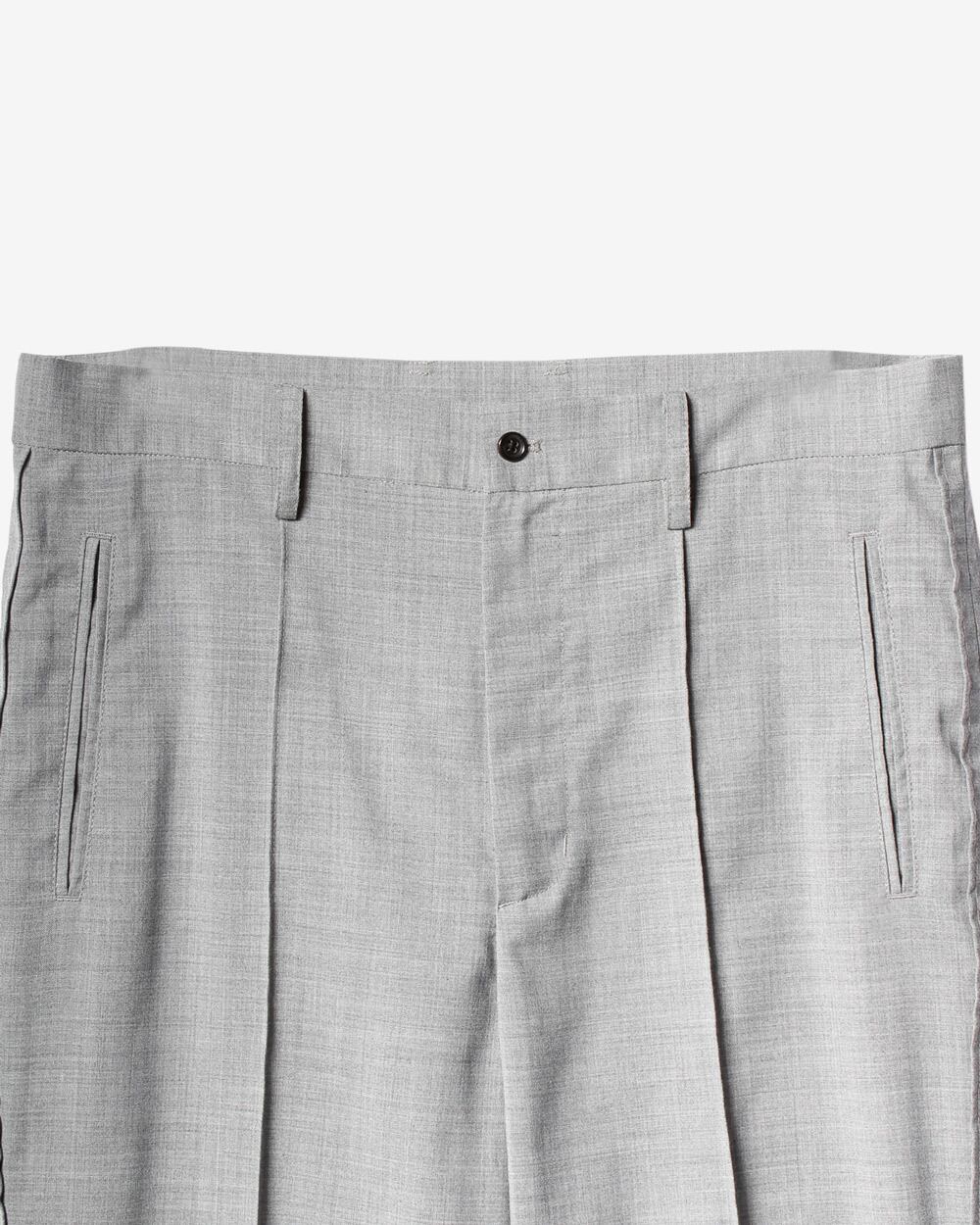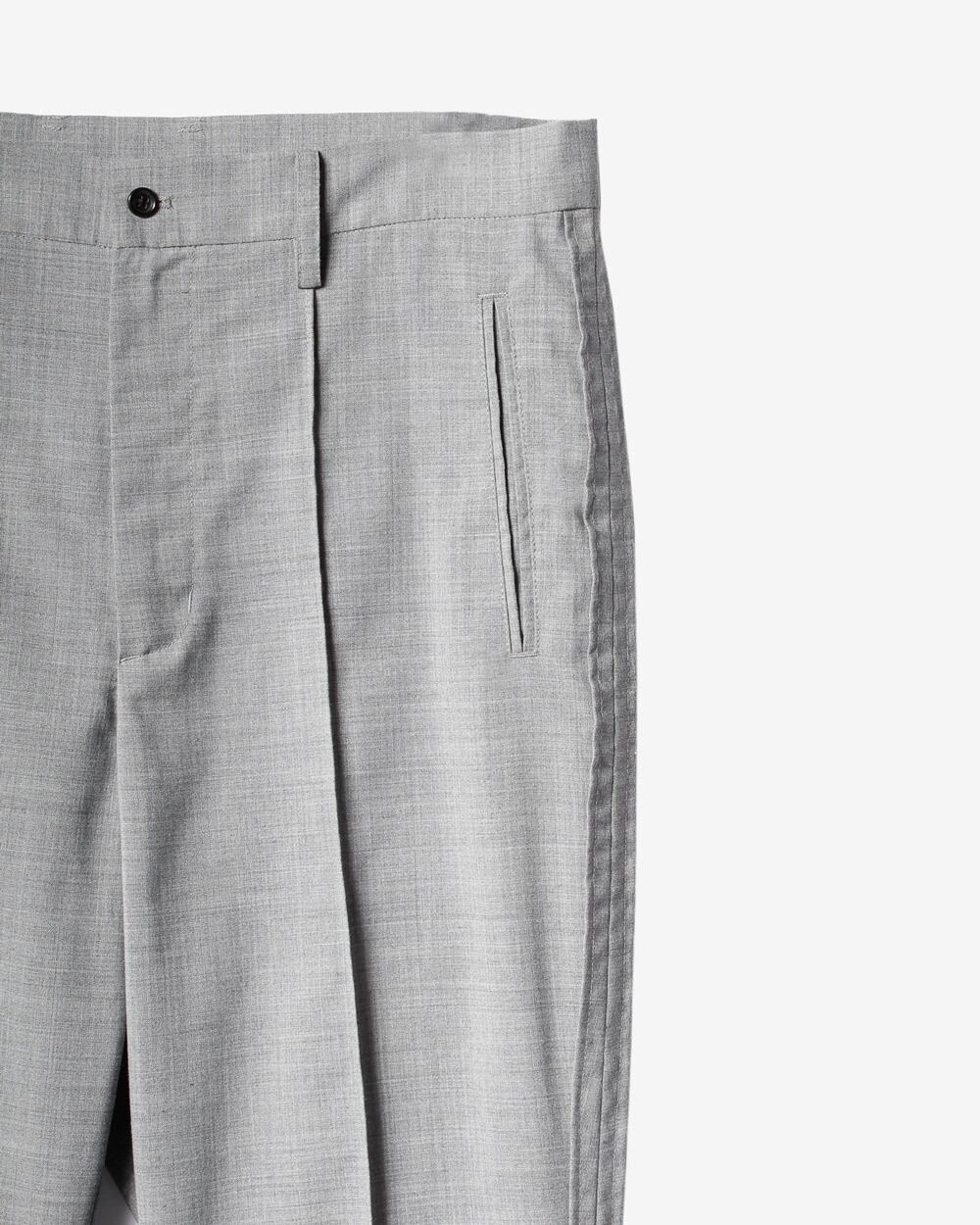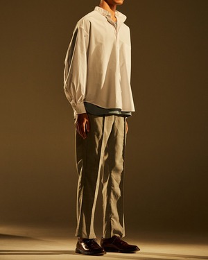 スリムシルエットなスラックスをベースにロシア軍のパジャマから着想を得た、裾にスリットを入れフレアシルエットにアレンジ