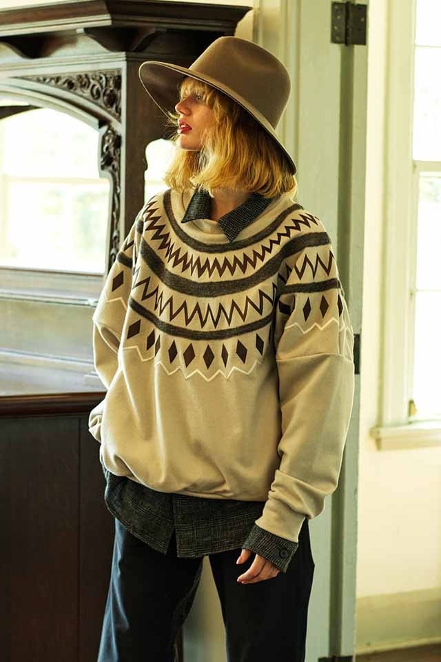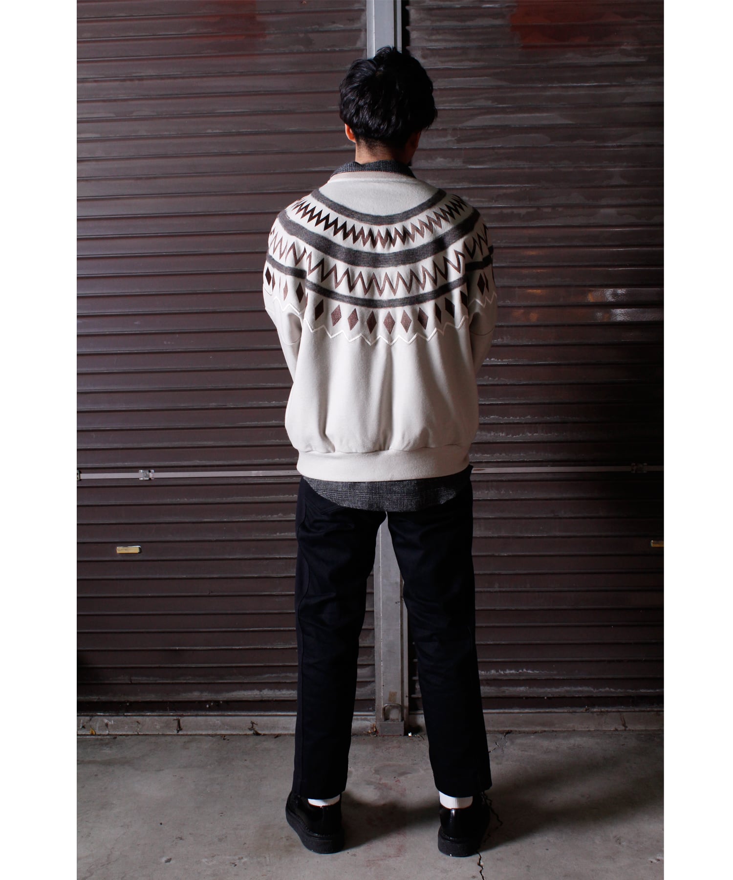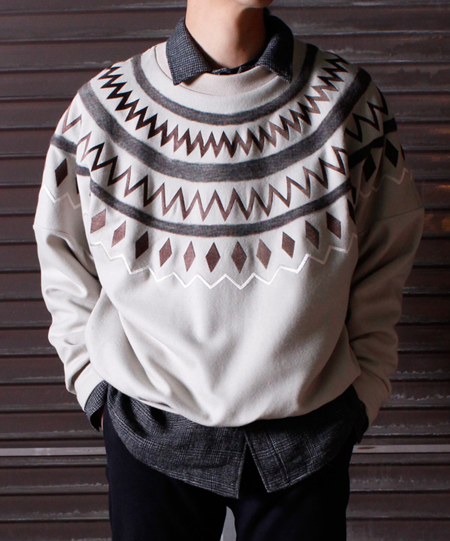 求心柄のニットをイメージしてニードルパンチと刺繍で柄を表現したクルーネックスウェット。